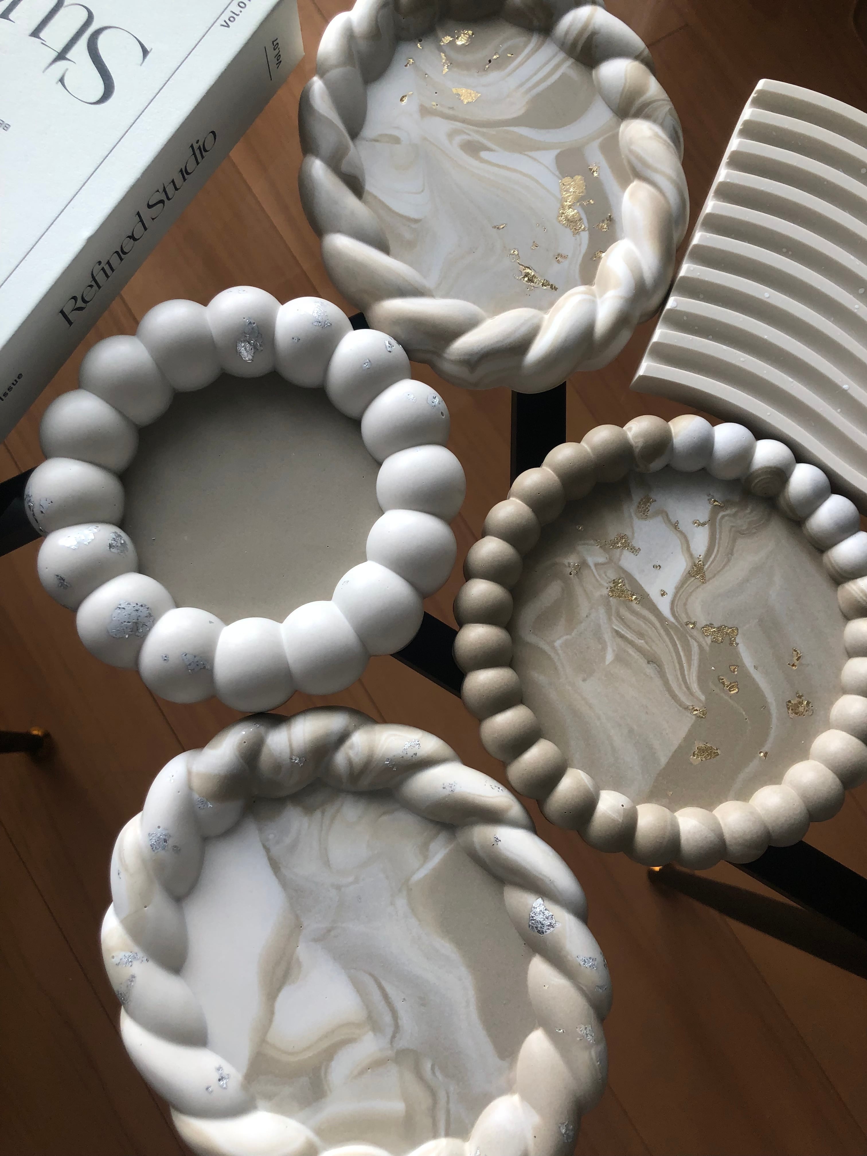 ご覧いただきありがとうございます。 BLUNEではジェスモナイトを使用したアクセサリートレイ、インテリア雑貨を制作しております。 ひとつひとつハンドメイドなので 世界にひとつだけのアイテムです。 お気に入りのアクセサリー、小物、キャンドル、お香、天然石、お花などと組み合わせてぜひお使いください✴︎ あなただけのお気に入りに出会えますように‥♡ ー作品詳細ー 【 7 】ホワイト×グレー ふちのぷっくり感が可愛い丸プレート⚪︎ size:13.4㎝ ー素材ー こちらの商品はジェスモナイトを使用しています。 ジェスモナイトは樹脂でありながら、石や陶器のような落ち着いた風合いをもつ素材です。 人体や環境にも優しい素材になっています。 (⚠︎・食べ物をのせる際は、ペーパーを敷いてください。 ・質感を変えない為にコーティングをしていないので、水に濡れるとシミができる可能性があります。) ー表面の気泡についてー ひとつひとつハンドメイドですので 表面に気泡が入ります。 商品の個性なのでご了承ください。 使用上問題はございません。 ご質問がありましたら お気軽にメッセージからお待ちしております✴︎ ☞注意事項 ・ご注文後のお客様都合による返品、交換は原則としてお受け致しかねます。あらかじめご了承ください。 ・商品到着後、万が一破損などがあった場合は7日以内にご連絡ください。それ以降は、返品・交換を承ることができません。 ・特性として表面・裏に気泡が入ります。 ・ハンドメイド作品やご理解いただける方のみご注文ください。
